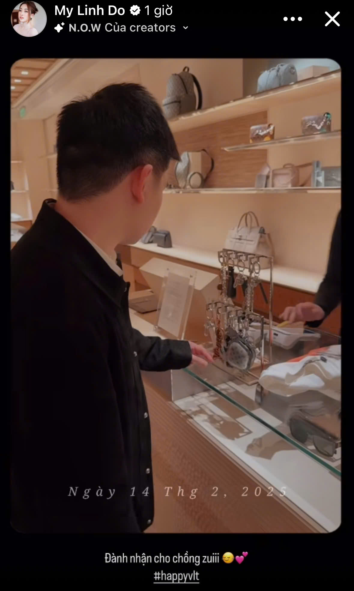 Cách đó vài giờ, trên story Facebook cá nhân, nàng hậu sinh năm 1996 cũng khoe chồng đang đưa cô đi shopping túi xách, trang sức,... nhân dịp 14/2. “Đành nhận cho chồng vui”, Đỗ Mỹ Linh còn hài hước chia sẻ thêm.