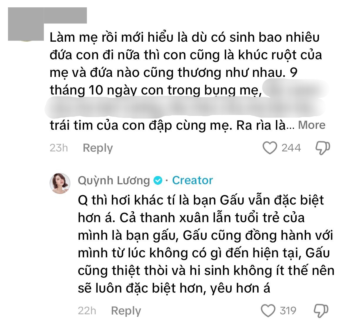 Sau đó, Quỳnh Lương cũng tâm sự thật lòng: "Quỳnh thì hơi khác tí là bạn Gấu vẫn đặc biệt á. Cả thanh xuân lẫn tuổi trẻ của mình là bạn Gấu. Gấu cũng đồng hành với mình từ lúc không có gì đến hiện tại. Gấu cũng thiệt thòi và hi sinh không ít nên sẽ luôn đặc biệt hơn, yêu hơn á".