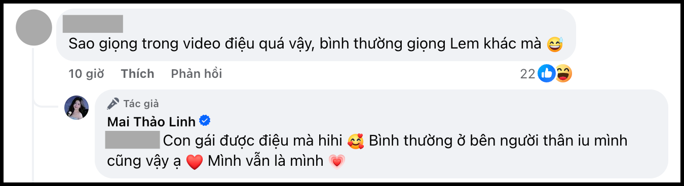 Trước thắc mắc này, Lọ Lem để lại bình luận trả lời: “Con gái được điệu mà. Bình thường ở bên người thân yêu mình cũng vậy ạ. Mình vẫn là mình”.