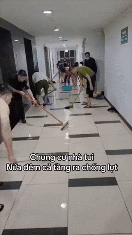 Khung cảnh tương tự cũng từng diễn ra ở một chung cư khác tại Hà Nội. Tất cả cư dân ai có chổi cầm chổi, ai có cây lau cầm cây lau, tập trung ra hành lang... tát nước!