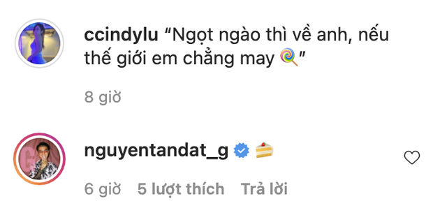 Kèm theo những hình ảnh "nuột" thế này thì tất nhiên cũng không thể thiếu một chiếc caption có nội dung hấp dẫn đi kèm rồi, Cindy viết trên trang cá nhân: "Ngọt ngào thì về anh, nếu thế giới em chẳng may". Vừa thả một câu sương sương vậy Đạt G đã vào để lại hình cái bánh luôn và ngay.