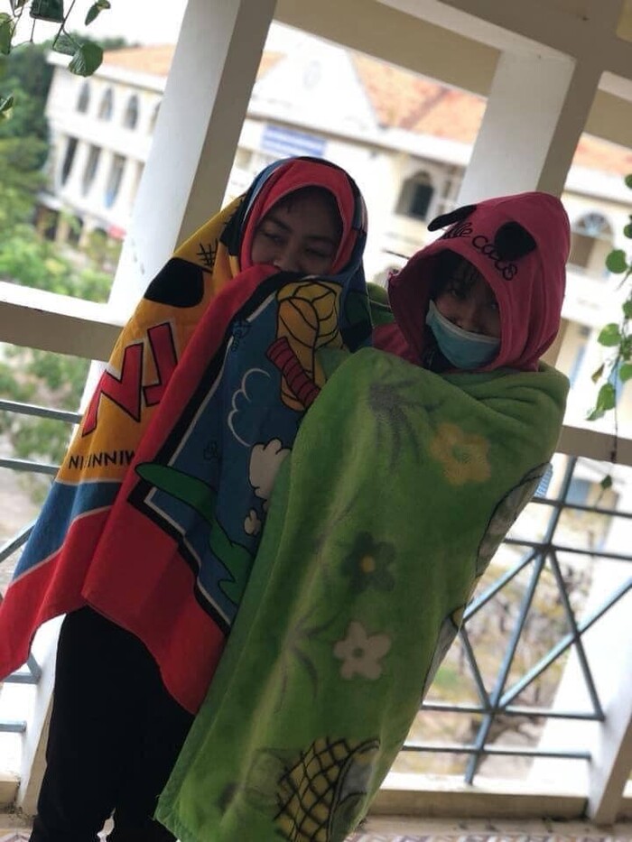 Có bạn vào lớp mới choàng khăn, trùm chăn, nhưng cậu bạn này còn khoác cả chiếc chăn len hoa lá đỏ rực ngay từ nhà và cứ thế chạy xe đến trường.