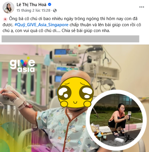 Ngày 15/2, mẹ Bắp lần đầu tiên chia sẻ lên Facebook về chuyện Bắp được kêu gọi gây quỹ trên nền tảng Give.Asia. “Ông bà cô chú ơi bao nhiêu ngày trông ngóng thì hôm nay con đã được quỹ Give.Asia chấp thuận và lên bài giúp con rồi cô chú ạ, con vui quá cô chú ơi. Chia sẻ bài giúp con nha” - Thu Hoà viết.