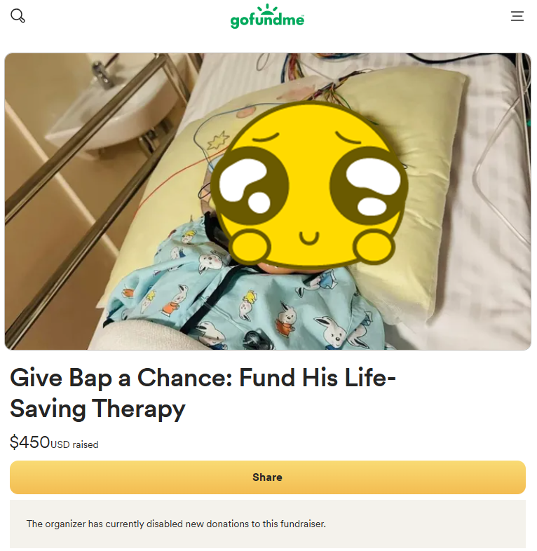 Trong khi đó chiến dịch gây quỹ cho bé Bắp ở GoFundMe cũng đã tạm dừng với thông báo trên website: “Hiện tại, người tổ chức đã vô hiệu hóa việc quyên góp mới cho chiến dịch gây quỹ này”. Tại đây không hiển thị thời gian chính xác dừng quyên góp nhưng tại thời điểm đó, số tiền đã được ủng hộ cho Bắp là 450 USD (gần 11,5 triệu đồng).