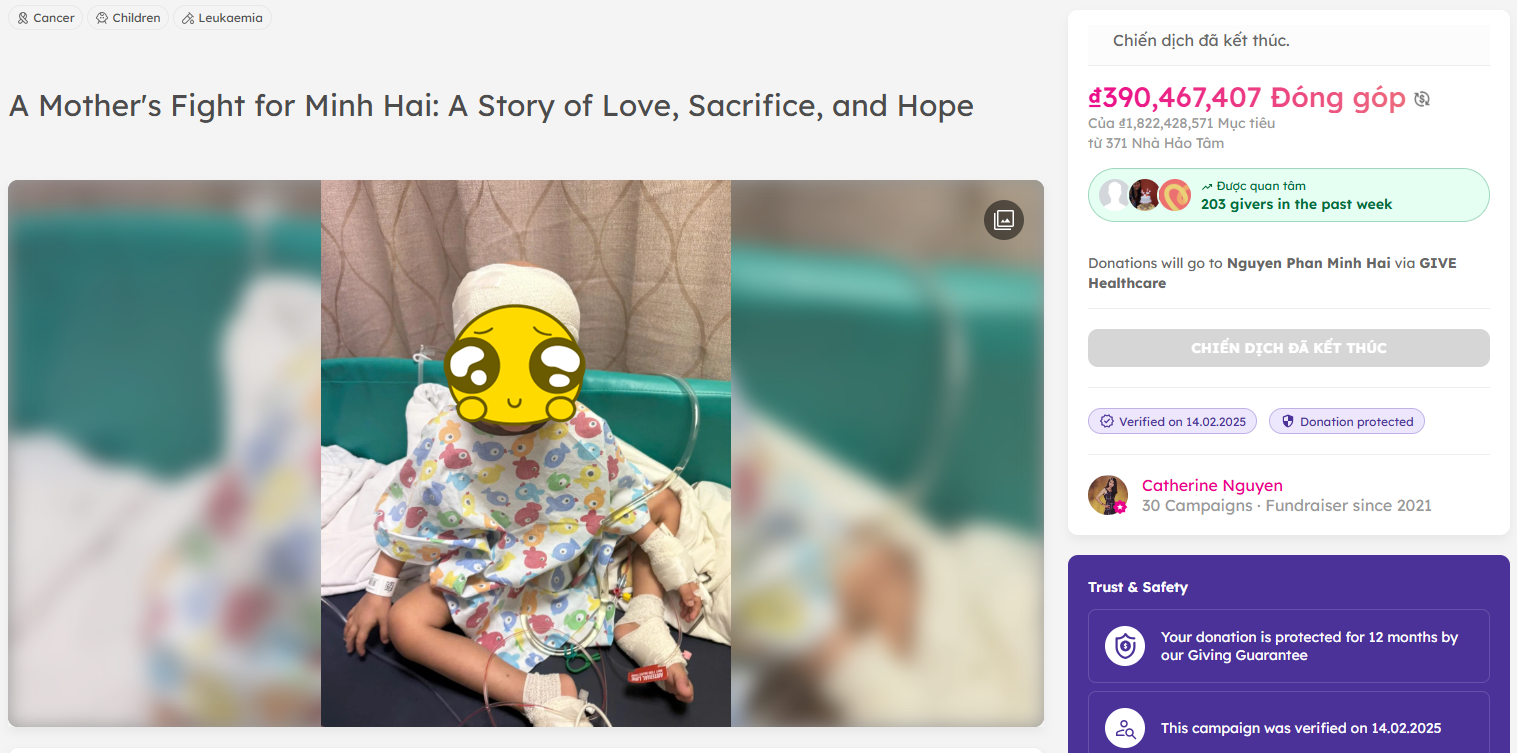 Theo thông tin trang web, chiến dịch dành cho bé Bắp có tên gọi là A Mother's Fight for Minh Hai: A Story of Love, Sacrifice, and Hope (tạm dịch: Cuộc chiến của một bà mẹ vì Minh Hải: Một câu chuyện của tình yêu, sự hy sinh và hy vọng). Chiến dịch được khởi xướng bởi người dùng Catherine Nguyen, bắt đầu từ ngày 14/2, mục tiêu quyên góp là 100.000 SGD, tương đương 1,9 tỷ đồng.
