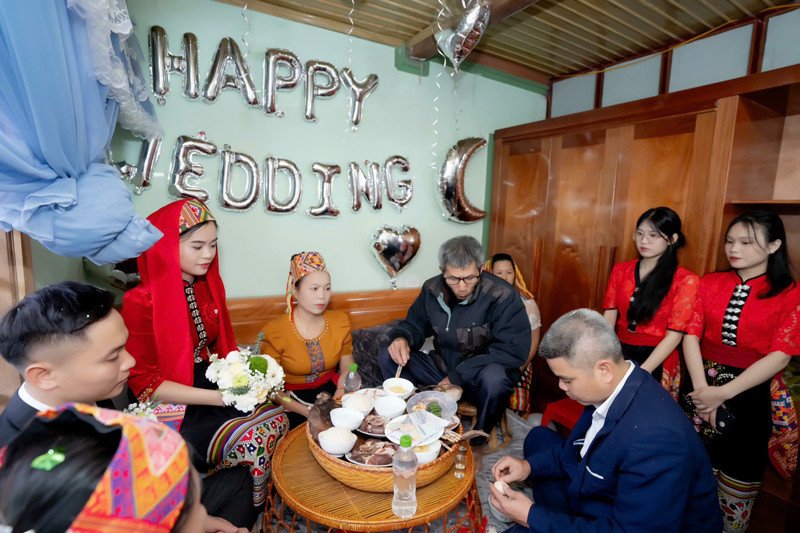 Trong phòng tân hôn, cô dâu, chú rể ngồi trước mâm cơm thịnh soạn gồm các món cơm trắng, thịt luộc, trứng luộc... Đối diện là thầy mo và ông mối.