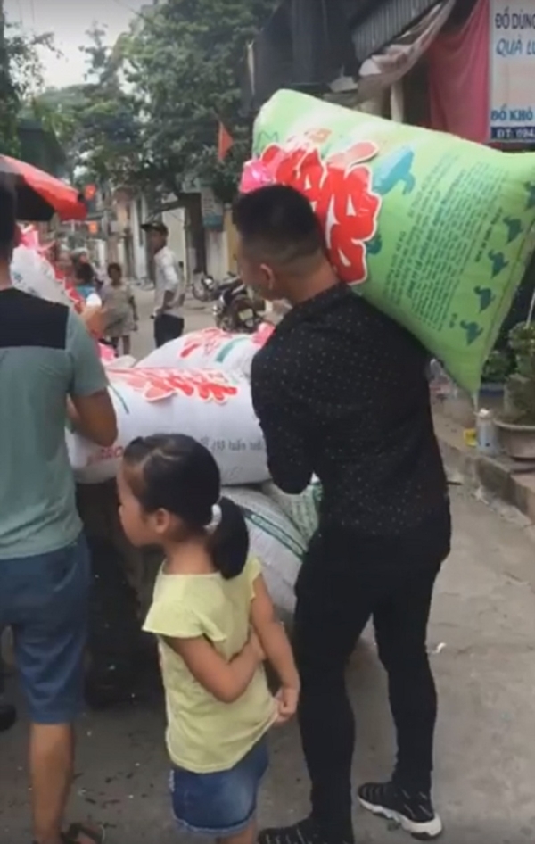 Khi đến tham dự đám cưới, mỗi thanh niên cao to đều khệ nệ vác bao gạo vào hội trường hôn lễ để dành tặng cô dâu chú rể.