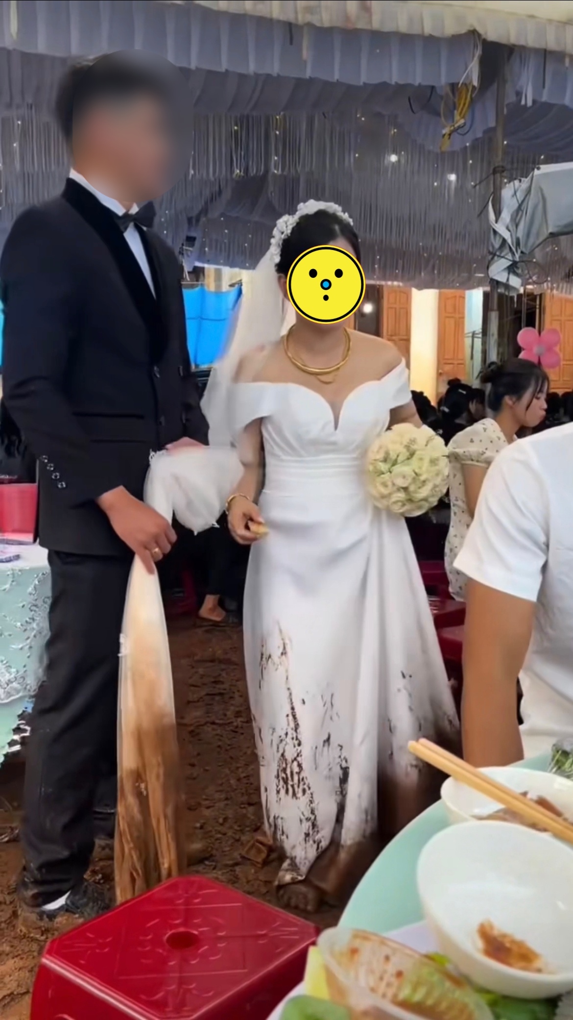 Theo như clip đăng tải, cô dâu mặc váy dài màu trắng, phải lội bùn đất trong đám cưới khiến chiếc váy trông vừa bẩn, mà hình ảnh của cô cũng nhếch nhác theo. Mặc dù chú rể đi theo giúp cầm khăn voan cho vợ nhưng chẳng đáng kể là bao. Vì phải đi trong bùn đất, tay xách váy nên cô dâu đi lại khó khăn, đôi khi còn như suýt ngã.