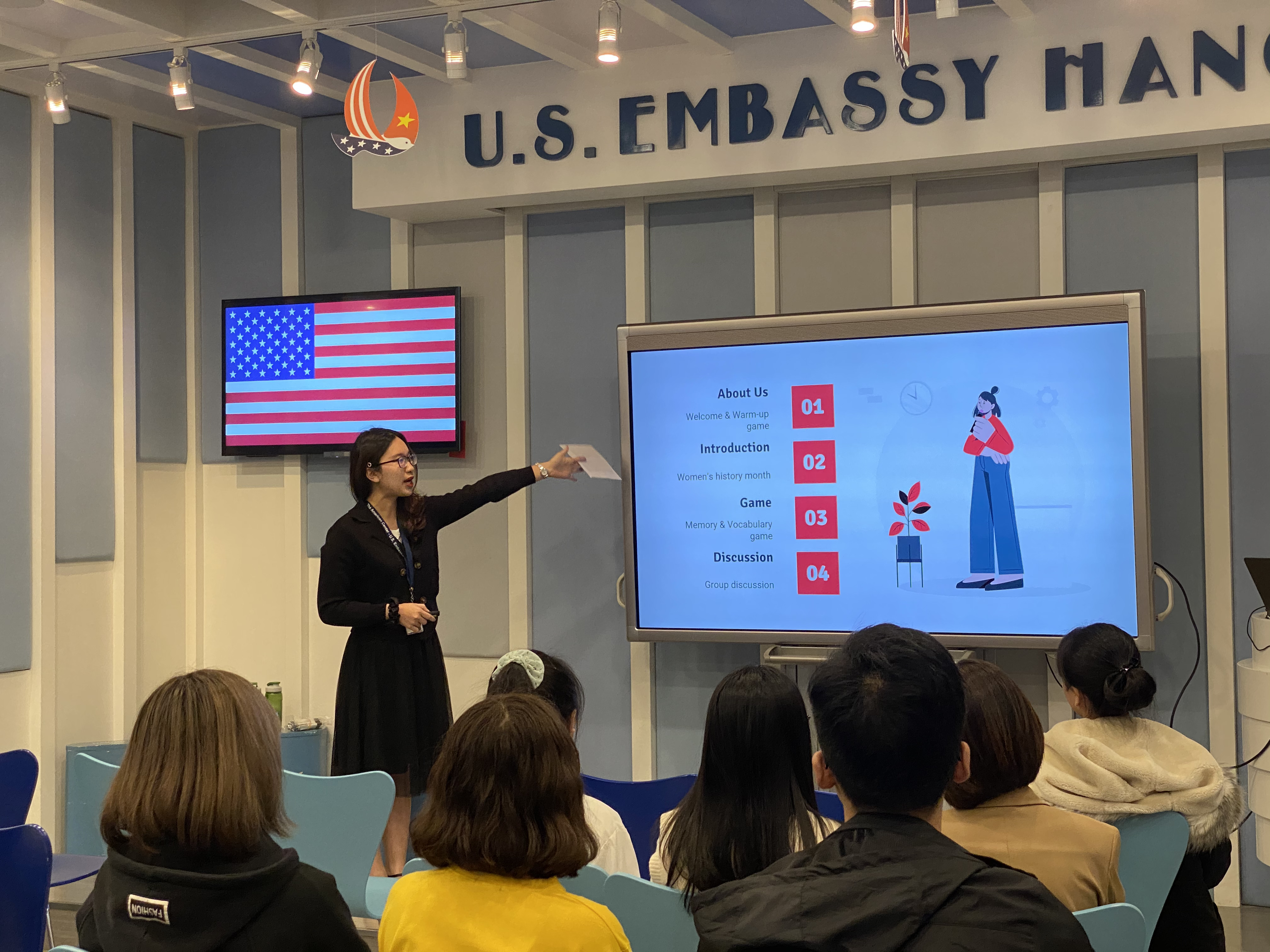 Lần này, Huyền đã đỗ và được phân công làm việc ở Phòng Thông tin và Văn hóa với nhiều hoạt động như: hỗ trợ phỏng vấn học bổng Fulbright, kỷ niệm sinh nhật YSEALI, hướng dẫn người đến thư viện…