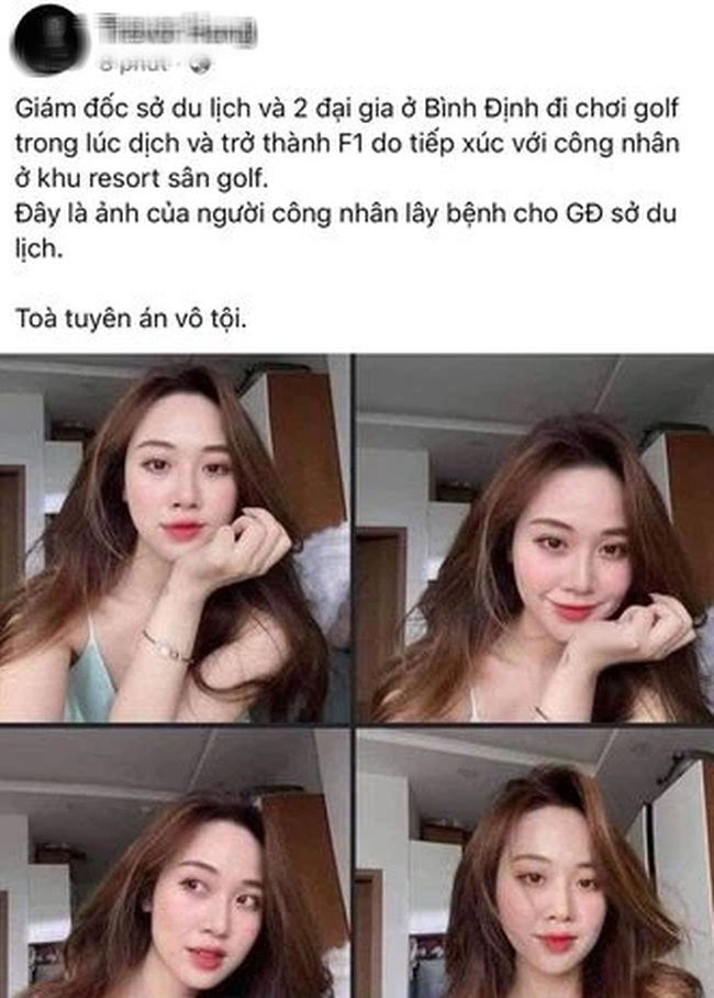 Tuy nhiên đến tối ngày 4/8, mạng xã hội lan truyền bài viết có nội dung về việc Giám đốc Sở Du lịch tỉnh Bình Định trở thành F1 sau khi tiếp xúc với công nhân sân golf, đồng thời chia sẻ hình ảnh một cô gái xinh đẹp và khẳng định người trong ảnh là F0 đã người đã "lây bệnh cho giám đốc Sở Du lịch Bình Định".