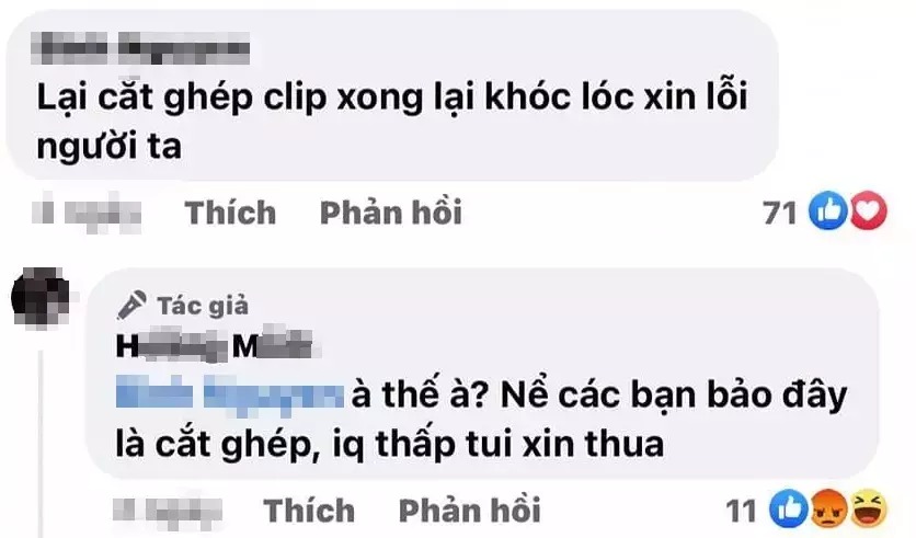Ở diễn biến khác, cư dân mạng phát hiện khi bị chỉ trích: "Lại cắt ghép clip xong khóc lóc xin lỗi người ta" - H.M mạnh miệng đáp: "Nể các bạn bảo đây là cắt ghép, IQ thấp tôi xin thua".