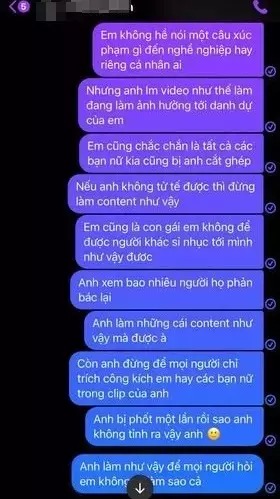 Bên cạnh đó, một trong những nạn nhân trong câu chuyện trên cũng đã nhắn tin ý kiến với chủ kênh H.M về việc cố tình cắt clip sai lệch làm ảnh hưởng đến danh dự của mình.