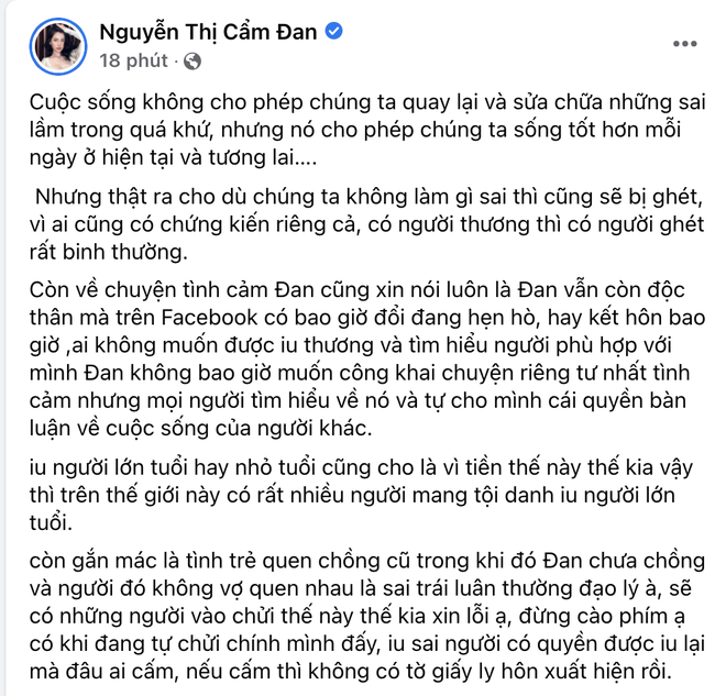 Đến giữa năm 2021, netizen “soi” ra đại gia Đức Huy thẳng tay unfollow Cẩm Đan. Về phía người đẹp thời điểm đó, cô nàng cũng nhiều lần ẩn ý độc thân trên trang cá nhân: "Định không yêu ai, ai ngờ không ai yêu luôn" . Hay trước câu hỏi của dân mạng "Chị Đan có bồ chưa ạ?" , chân dài đáp: "Chị còn nguyên chế độ độc thân. Đừng tin vào những lời ong bướm ở những thứ em đọc nữa. Tin chị đi".