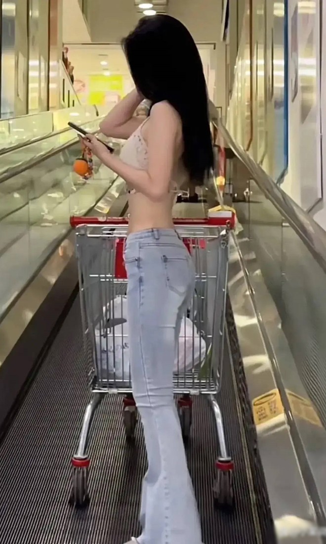 Mới đây, trên các diễn đàn về thời trang, thời trang đường phố của Trung Quốc đăng tải nhiều hình ảnh, clip một cô gái đi mua sắm trong siêu thị diện bộ trang phục khoe dáng với áo bra hở lưng, phối cùng quần jeans ống loe.