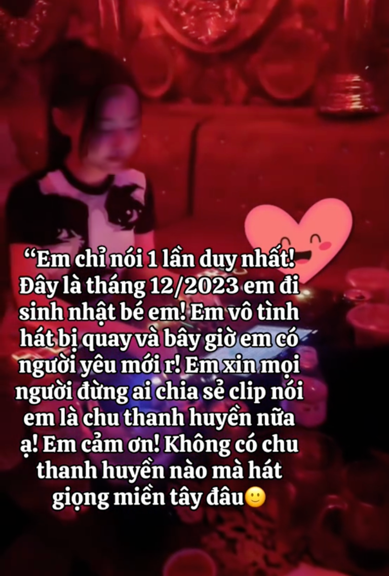 Đến hôm nay 28/3, cô gái trong đoạn video kể trên đã chính thức lên tiếng, gián tiếp minh oan cho Chu Thanh Huyền. Cô gái có nickname T.S.T thừa nhận mình là người trong video quán karaoke: "Em chỉ nói 1 lần duy nhất! Đây là tháng 12/2023 em đi sinh nhật bé em! Em vô tình hát bị quay và bây giờ em có người yêu mới rồi! Em xin mọi người đừng ai chia sẻ clip nói em là Chu Thanh Huyền nữa ạ! Em cảm ơn! Không có Chu Thanh Huyền nào mà hát giọng miền Tây đây".