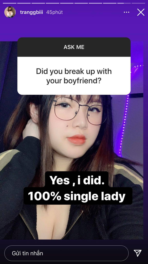 Tuy nhiên mới đây, Thu Trang thẳng thắn thông báo rằng đã chia tay người yêu ở phần Q&A trên Instagram. Cụ thể khi được hỏi có phải đã chia tay bạn trai không, cô nàng không ngại khẳng định: "Đúng rồi. Tôi đã chia tay. 100% độc thân".
