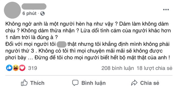 Đối với mọi người tôi *** thật nhưng tôi khẳng định mình không phải người thứ 3. Không có tôi thì mọi chuyện mãi mãi sẽ không được phơi bày... Đừng để tôi cho mọi người biết hết bộ mặt thật của anh!".