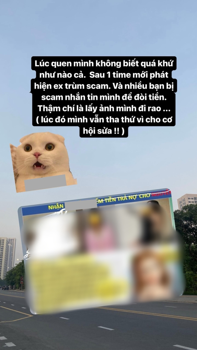 Sau một thời gian quen nhau, M. phát hiện người yêu cũ lừa tiền của một số người vì những người này nhắn tin cho cô để đòi tiền. Thậm chí anh ta còn lấy ảnh của bạn gái mang đi rêu rao: “Nhận ** ***** kiếm tiền trả nợ…” nhưng M. vẫn tha thứ và cho cơ hội sửa chữa.