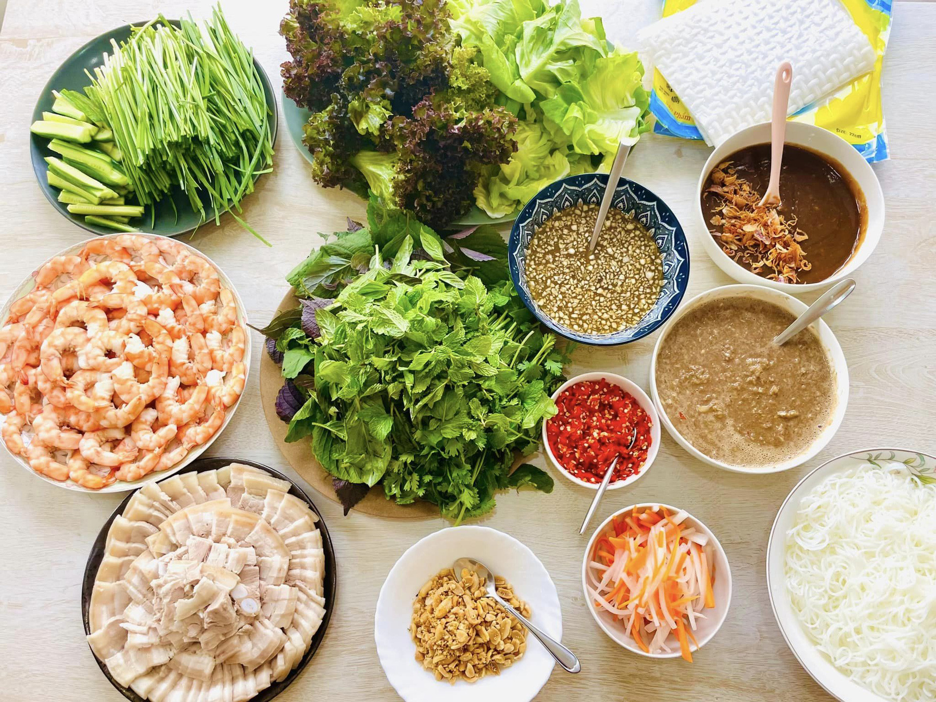 Một mâm gỏi cuốn đủ bộ 3 loại nước chấm: Nước mắm chua ngọt, tương đậu phộng, mắm nêm. Đồ chua, đậu phộng, rau thơm và hẹ là những gia vị không thể thiếu. Trang phải đi 3 siêu thị và mua thêm đồ xách tay của người Việt mang sang để nấu được bữa gỏi cuốn này.