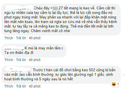 Bên cạnh đó, có rất nhiều cư dân mạng chia sẻ rằng bản thân cũng từng bị trường hợp như trên và nếu không xử lý kỹ, rất có thể để lại hậu quả nghiêm trọng. Keo 502 chứa rất nhiều thành phần hóa chất gây độc hại và có thể làm teo, bỏng giác mạc, thậm chí là rách giác mạc nếu không xử lý đúng cách. Nhiều chuyên gia y tế cũng khuyến cáo mọi người khi sử dụng các loại keo dán thì nên sử dụng cần thận, để xa tầm mắt, nên đeo kính bảo hộ và sử dụng găng tay cao su.