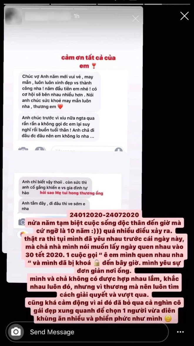 Trước đó, sáng 8/8, trên MXH đã lan truyền loạt tin nhắn yêu đương được cho là của Jack và Q. dù chưa được xác thực. Trong những tin nhắn này, đối phương liên tục dành những lời vô cùng ngọt ngào cho Q như: "Mập yêu ngủ ngoan, thương em"/ "Cả cuộc đời sau này bù cho tuiii"/ "Chúc vợ anh năm mới vui vẻ, may mắn, luôn luôn xinh đẹp, thành công nha! Năm đầu tiên em nhé, có cơ hội sẽ bên nhau nhiều hơn",...