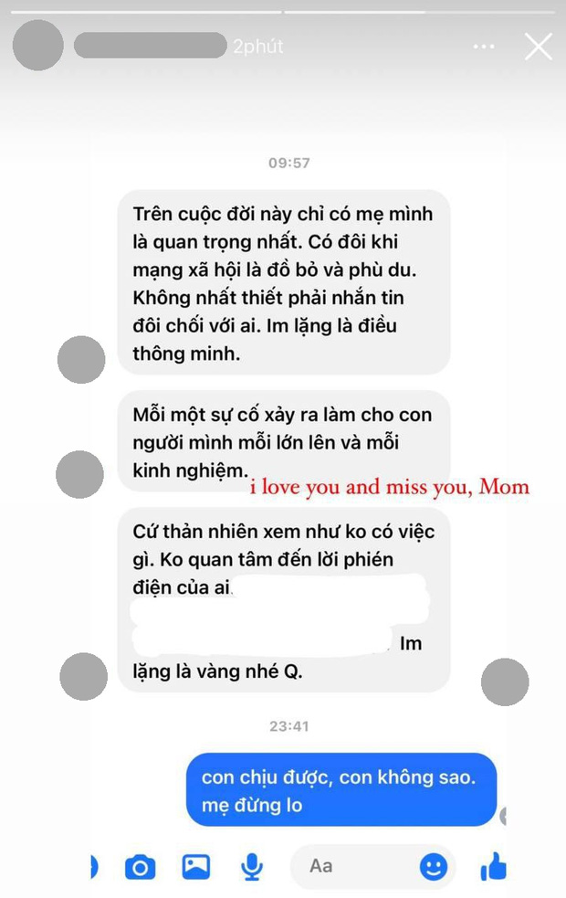 Trả lời những tin nhắn này từ mẹ, Q. cho biết tình hình hiện tại của mình: "Con chịu được, con không sao. Mẹ đừng lo". Ngoài ra cô nàng cũng ghi caption bày tỏ tình cảm với mẹ: "I love you and miss you, mom".