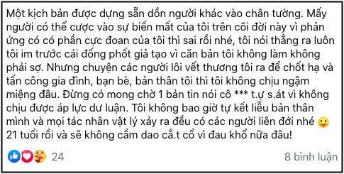 Có thể thấy, sự việc ngày càng trở nên rối rắm hơn khi D. liên tục đưa ra thêm nhiều tình tiết. Đến giờ phút này, phía các thanh niên chưa có thêm lời phản hồi nào còn D. cũng cập nhật trạng thái trang cá nhân rằng kiên quyết sẽ không tự kết thúc cuộc đời mình trước áp lực dư luận.