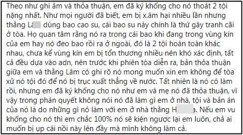 "Theo như ghi âm và thỏa thuận, em đã ký khống cho nó thoát 2 tội nặng nhất. Như mọi người đã biết, em bị xâm hại nhiều lần nhưng thằng L. dùng bao cao su, cái bao cao su này chính là thứ gây tranh cãi ở tòa.