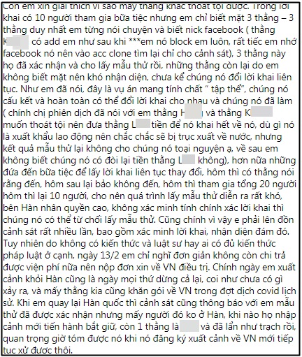 Vụ việc cô gái du học sinh người Việt tên Đ.D bị 4 thanh niên hiếp dâm tập thể đã khiến cư dân mạng xôn xao suốt mấy ngày qua.Hiện tại, bài viết của D. trong nhóm Facebook vẫn thu hút rất đông lượng người tương tác vì có nhiều điều gây phẫn nộ. Và mới nhất, D. đã cập nhật thêm trạng thái với những tình tiết hoàn toàn mới, trong đó có việc cô từng bị một người đàn ông Hàn Quốc quấy rối, giở trò đồi bại ngay trước sự việc nói trên chỉ vài ngày.