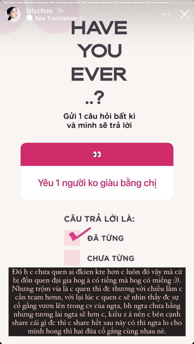 Một fan hỏi Chù đã bao giờ yêu một người không giàu bằng mình chưa. Câu trả lời của cựu hot girl không khỏi làm mọi người bất ngờ, vì đáp án là đã từng. Thậm chí gái xinh không ngại cho hay từ trước đến nay, cô nàng chưa quen ai có điều kiện kinh tế hơn mình cả. Sự thật là vậy nhưng Chù vẫn cứ bị đồn quen đại gia hoài, điều này khiến cô nàng khá bực vì... có tiếng mà không có miếng.