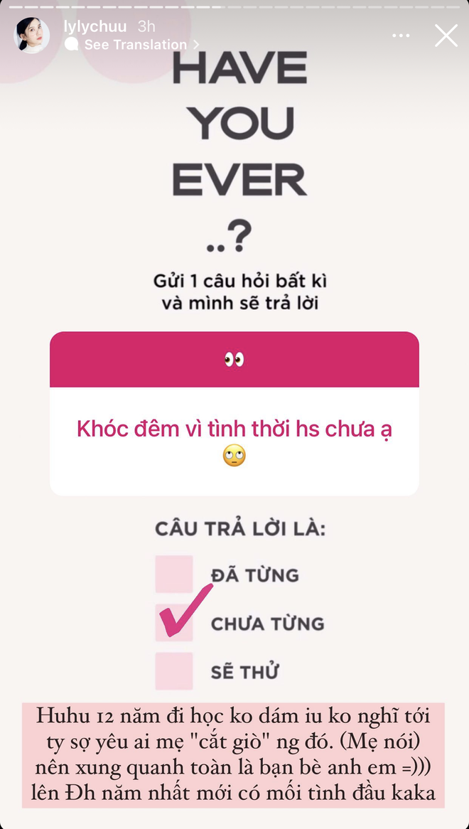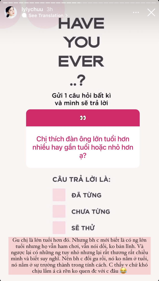 Cũng trong loạt hỏi đáp này, Chù còn tiết lộ một vài thông tin thú vị khác như việc cô nàng lần đầu có người yêu là tận năm lên đại học do bị gia đình cấm đoán. Hay gu bạn trai của Chù đã đổi từ lớn tuổi hơn thành tính cách chững chạc hơn, còn tuổi tác không ảnh hưởng nhiều lắm.