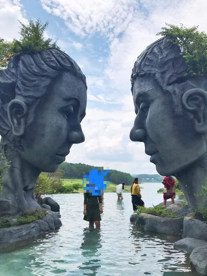 Theo hình ảnh được tài khoản Facebook có tên Thủy Đặng đăng tải, cô gái (váy đỏ) thản nhiên kéo váy rồi tiểu vậy ngay dưới chân bức tượng khổng lồ vốn làm nên tên tuổi cho hồ Vô Cực.