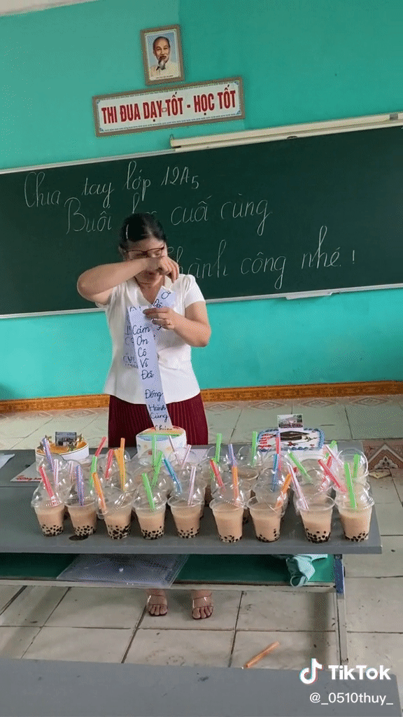 Theo đó, lớp học chuẩn bị 3 chiếc bánh kem cùng nhiều ly trà sữa để liên hoan trong buổi chia tay này. Trong chiếc bánh kem ở giữa, các bạn học trò đã bí mật chuẩn bị lời nhắn gửi đến cô giáo chủ nhiệm đã đồng hành cùng lớp suốt 3 năm qua.