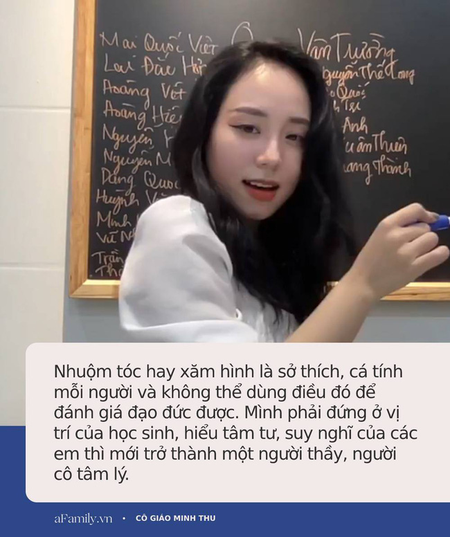 Nói thêm về bí quyết thân thiết với học sinh, cô giáo Minh Thu chia sẻ: "Mình phải hiểu về từng thế hệ học sinh. Chẳng hạn thế hệ mình, phụ huynh thường bắt con phải truyền thống, nề nếp, không được nhuộm tóc, phải ăn mặc gọn gàng,... Thực tế thì nhuộm tóc hay xăm hình là sở thích, cá tính mỗi người và không thể dùng điều đó để đánh giá đạo đức được. Mình phải đứng ở vị trí của học sinh, hiểu tâm tư, suy nghĩ của các em thì mới trở thành một người thầy, người cô tâm lý được".
