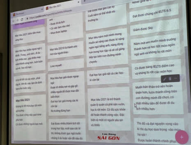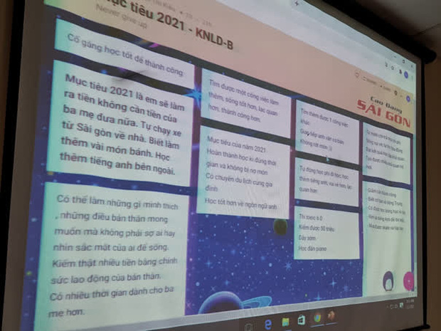 Tiết học đã trở nên thú vị hơn và cũng nhờ việc làm của cô giảng viên mà các bạn đã có những chia sẻ vô cùng thú vị. Có bạn mong kiếm được 300 triệu, có bạn mong qua môn, và cũng có những tâm thư thật xúc động: "Mục tiêu 2021 là em sẽ làm ra tiền không cần tiền ba mẹ đưa nữa. Tự chạy xe từ Sài Gòn về nhà. Biết làm thêm vài món bánh. Học thêm tiếng Anh bên ngoài"...