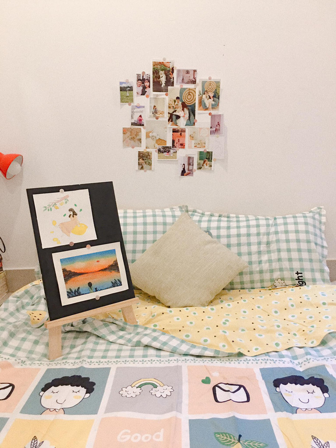 "Mình nhận phòng trong tình trạng thấm nước và vết bẩn khắp tường nên việc đầu tiên mình làm là tạm biệt ngay bức tường xấu xí. Mình và bạn dùng sơn trắng tự sơn để tiết kiệm chi phí và giúp cả căn phòng sáng hơn, tạo cảm giác rộng rãi". - Mỹ Duyên cho biết.