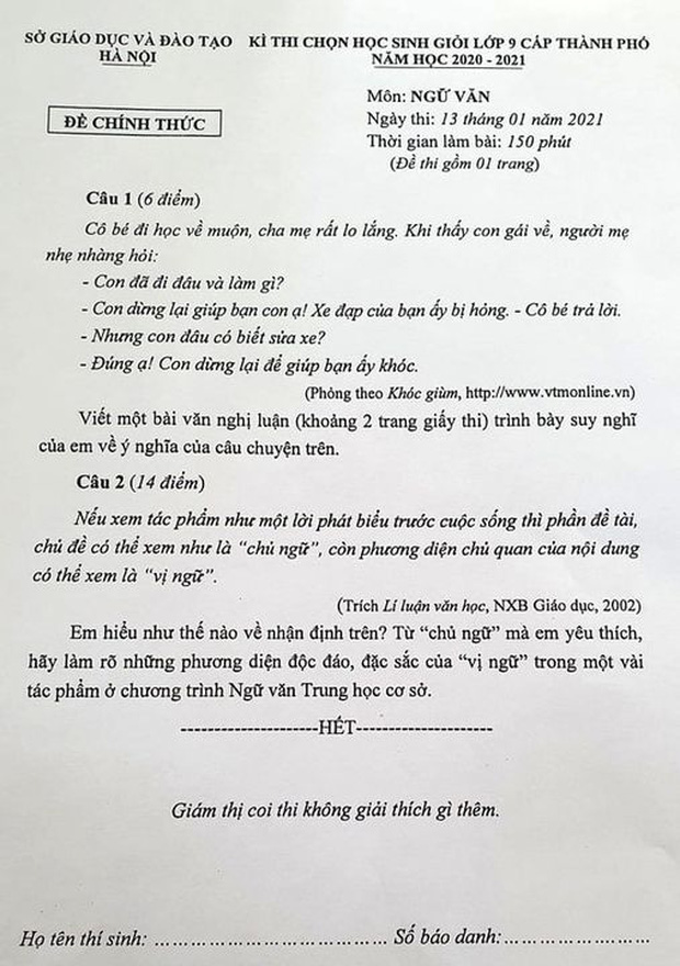 Nhiều ý kiến cho rằng đề thi Ngữ văn lớp 9 dành cho học sinh giỏi cấp thành phố của Hà Nội gây "hại não" khi quá tầm học sinh.