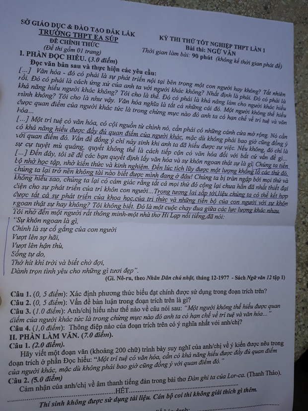 Cụ thể, phần đọc hiểu trích một đoạn văn bản (Gi, Nê-ru, theo Nhân Dân chủ nhật, tháng 12-1997, sách Ngữ văn 12 tập 1), từ đó đưa ra 4 câu hỏi.