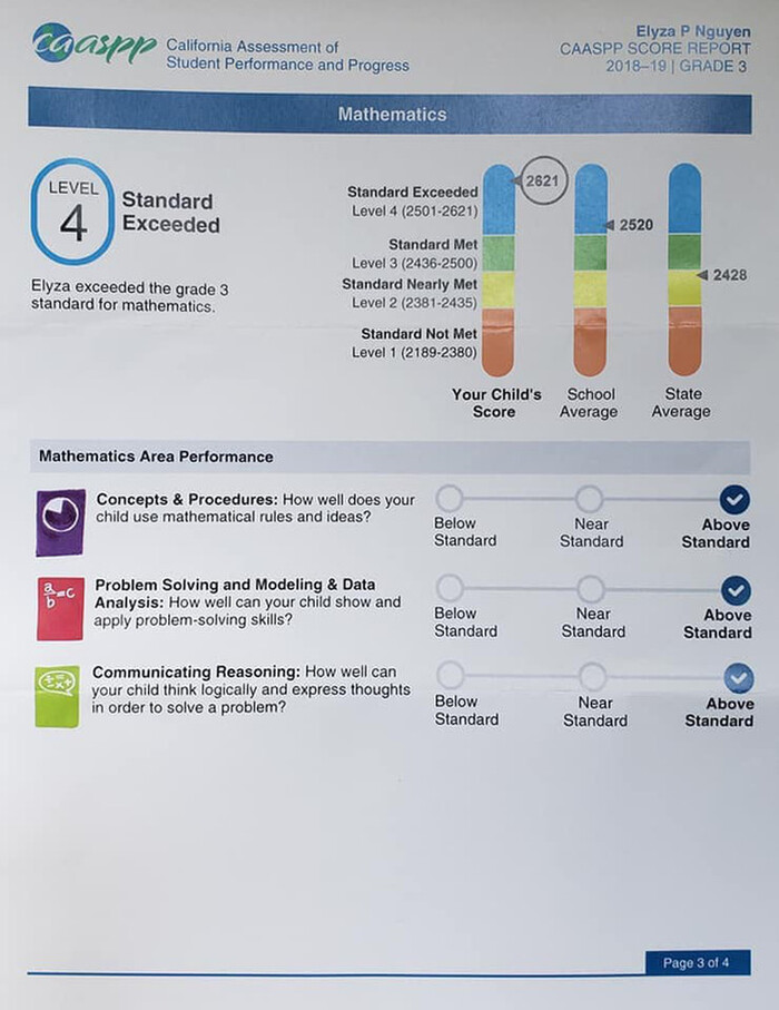 Bé Elyza thừa hưởng nhiều đường nét nổi bật của bố mẹ, đặc biệt, bé có nụ cười rạng rỡ và má lúm đồng tiền duyên dáng. Ngoài vẻ ngoài hút mắt, ái nữ nhà Việt Hương còn sở hữu bảng thành tích ấn tượng. Cô bé từng giành huy chương đồng môn wushu, lọt top 10 học sinh giỏi nhất trường. Đáng chú ý, điểm số tất cả các môn của Elyza từng nằm trong danh sách những người cao nhất toàn tiểu bang California, với điểm toán đạt tuyệt đối 2621 điểm.