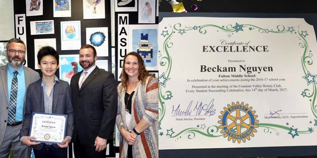 "Beckam đi lãnh giải thưởng và 500 USD (hơn 11 triệu đồng) do Rotary Club trao tặng. Trong 6.300 học sinh ở Fountain Valley School District có 11 học sinh được đề cử từ 11 trường khác nhau để nhận giải thưởng đặc biệt ngày hôm nay, và trong danh sách 11 học sinh đó có Beckam. Lúc nào mẹ cũng tự hào về con trai cho dù con có được giải thưởng hay là không".