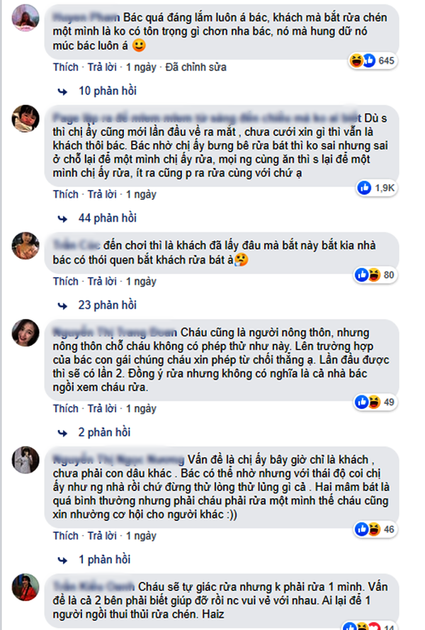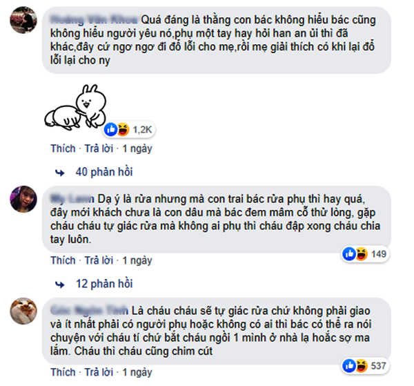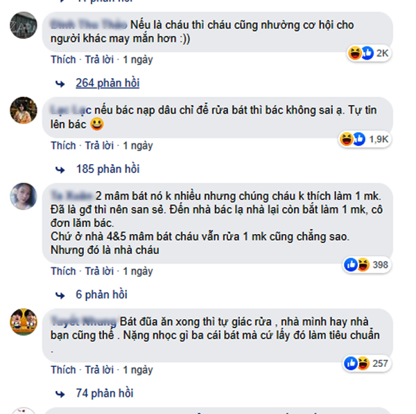 Ngay lập tức phía dưới bài đăng là hàng loạt các comment của cộng đồng mạng. Mọi người đều cho rằng việc thử thách rửa bát của mẹ chồng tương lai là không nên bởi vậy sẽ tạo những ám ảnh đối với các cô gái khi về ra mắt. Hơn nữa một số người góp ý thay vì thử thách thì hãy tạo cơ hội trò chuyện để cả gia đình gần gũi nhau hơn. Hoặc nếu như có rửa bát thì cũng nên có người phụ giúp để cô gái không cảm thấy lạc lõng, tủi thân vì chỉ có 1 mình.