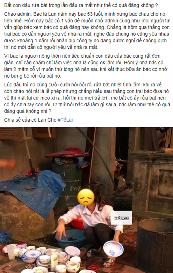 Trong bài chia sẻ, bác gái tên Lan, 53 tuổi thẳng thắn đặt vấn đề: "Hôm nay bác có 1 vấn đề muốn nhờ admin cũng như mọi người tư vấn giúp bác xem bác có quá đáng hay không. Chẳng là hôm qua thằng con trai bác có dẫn người yêu về nhà ra mắt, nghe đâu chúng nó cũng yêu nhau được khoảng 1 năm rồi nhân dịp công ty nó đang được nghỉ để ch ống d ịch thì nó mới dẫn cô người yêu về nhà ra mắt.