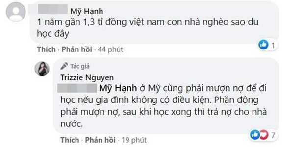 Khi có netizen thắc mắc: "1 năm gần 1,3 tỷ đồng Việt Nam, con nhà nghèo sao du học đây", vợ cũ Bằng Kiều đã không ngại chia sẻ: "Ở Mỹ cũng phải mượn nợ để đi học nếu gia đình không có điều kiện. Phần đông phải mượn nợ, sau khi học xong thì trả nợ cho nhà nước".