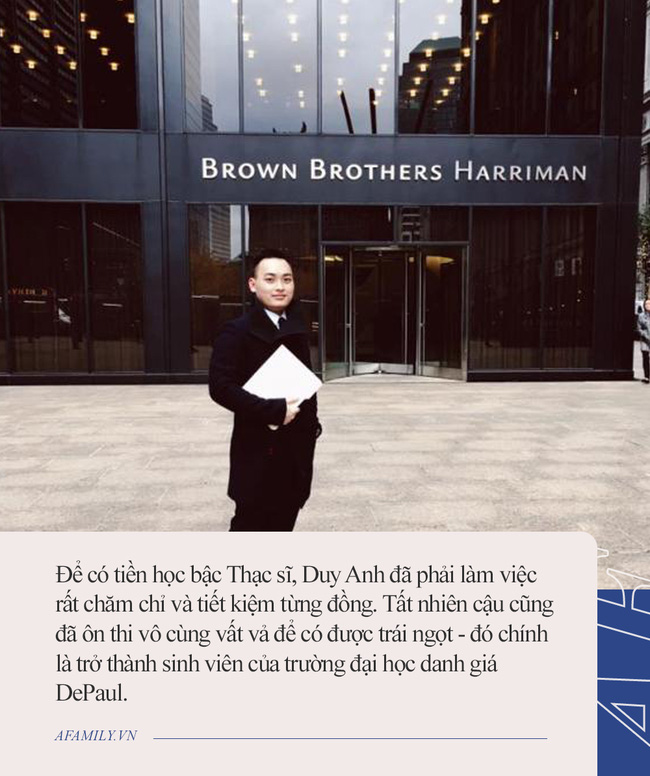 Sau khi biết đến danh tiếng, cũng như chất lượng giảng dạy của Đại học DePaul, nhiều người không khỏi ngỡ ngàng trước thành tích học tập xuất sắc của Duy Anh. Theo những gì chàng trai 9x chia sẻ trên trang cá nhân thì để có tiền học bậc Thạc sĩ, cậu đã phải làm việc rất chăm chỉ và tiết kiệm từng đồng. Tất nhiên Duy Anh cũng đã ôn thi vô cùng vất vả để có được trái ngọt - đó chính là trở thành sinh viên của trường đại học danh giá này.