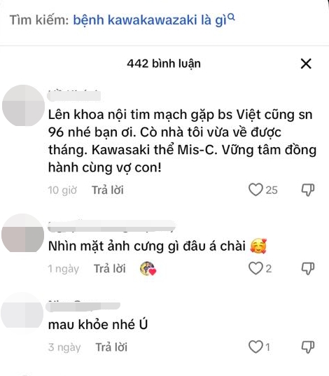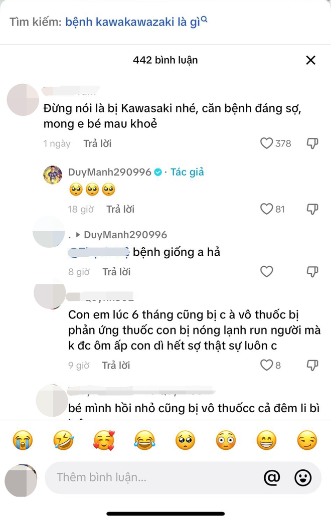 Bên cạnh đó, nhiều người tò mò không biết con trai Duy Mạnh mắc bệnh gì, phía dưới phần bình luận, mọi người thi nhau hỏi thăm. Một fan hỏi: "Đừng nói là bị Kawasaki nhé, căn bệnh đáng sợ, mong em bé mau khỏe". Đáp lại, Duy Mạnh chỉ thả vài icon có hình mặt khóc. Điều này khiến nhiều người tin rằng phán đoán này là đúng. Không ít người khác cũng thi nhau chúc Ú mau khỏi và rất lo lắng về bệnh này.