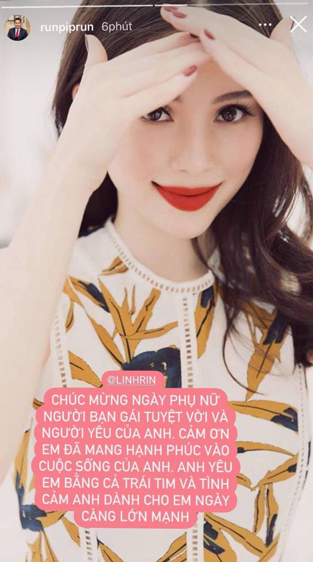 Bình thường đã thế, tất nhiên những dịp quan trọng, lễ lộc trong năm làm sao cặp đôi có thể ngồi yên được chứ. Bằng chứng là sớm ngày Phụ nữ Việt Nam 20/10, thiếu gia nhà tỷ phú đã chào buổi sáng bằng một đoạn tâm thư ngắn, bày tỏ tình yêu với Linh Rin rồi đây.