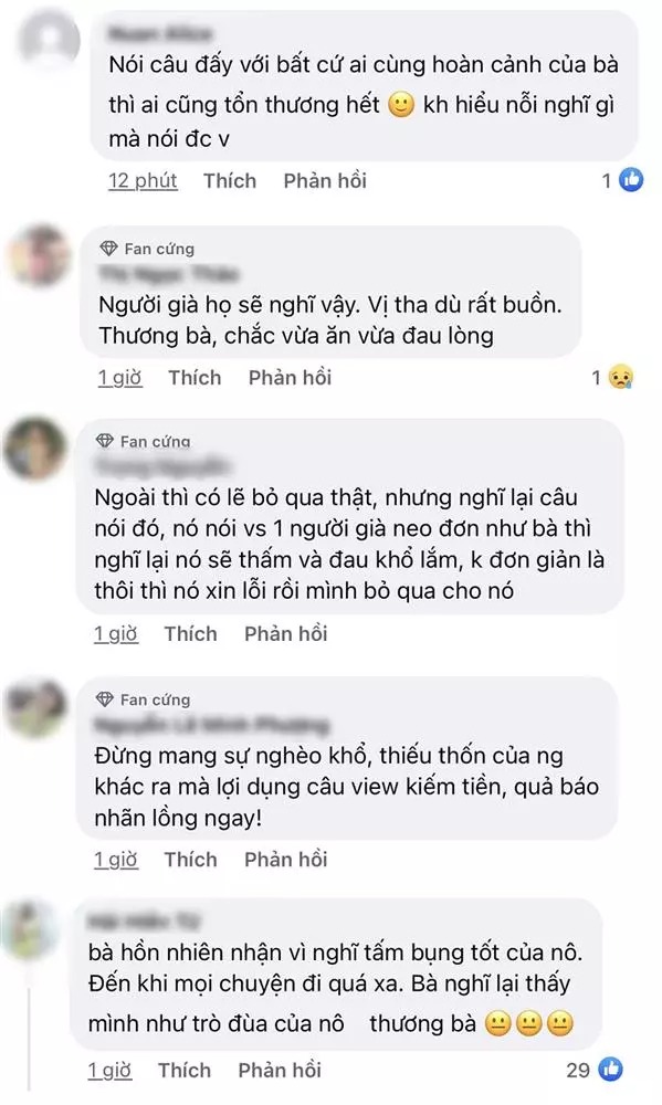 Cũng ở lần lên sóng này, bà tiết lộ rất buồn, chỉ vì bát phở 55.000 đồng mà bị một người đáng tuổi con cháu có những câu nói và cách cư xử không đúng mực.