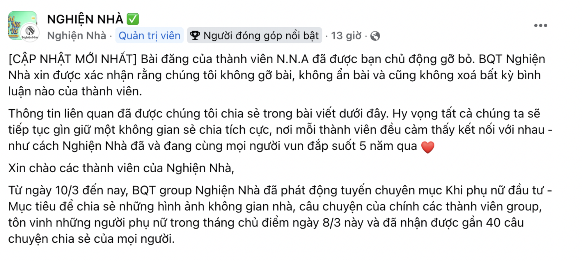 Trong đó, admin group Nghiện Nhà khẳng định: "BQT Nghiện Nhà chưa từng và sẽ không bao giờ liên kết với bất kỳ cá nhân, đội nhóm nào để kêu gọi đầu tư vào các loại tài sản không được quản lý bởi pháp luật Việt Nam."