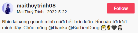 Trước đó, vào tháng 5 năm 2022, khi thủ môn Bùi Tiến Dũng và nàng WAG ngoại quốc Dianka bất ngờ tổ chức lễ cưới riêng tư, Mai Thùy Trinh cũng tham dự lễ cưới của anh chồng. Cô nàng đăng tải video của Tiến Dũng và Dianka với lời cảm thán: "Nhìn lại xung quanh mình cưới hết trơn luôn. Rồi nào tới lượt mình đây".