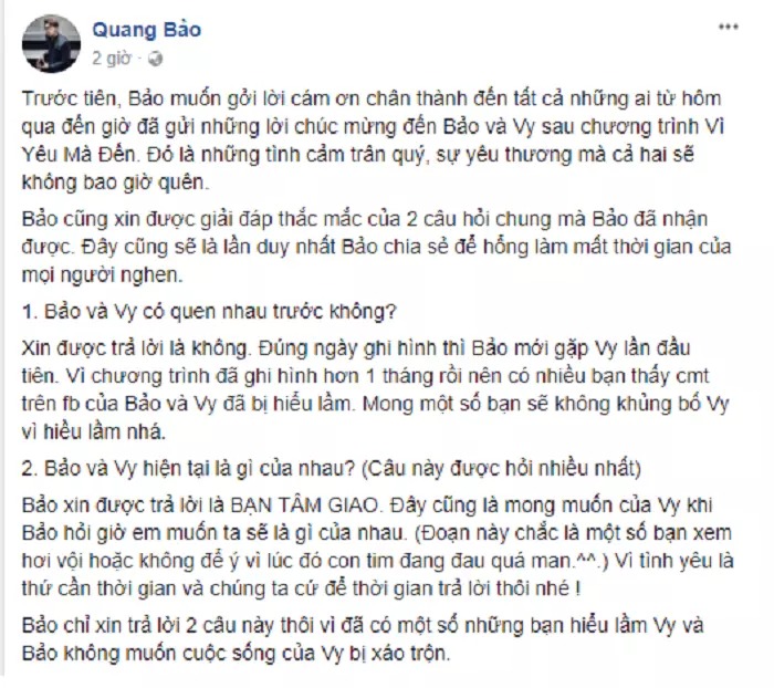 Ngay khi show kết thúc, Quang Bảo lại khẳng định mình và Vy chỉ là bạn tâm giao. Anh viết trên Facebook cá nhân: “Trước tiên, Bảo muốn gửi lời cảm ơn chân thành đến tất cả những ai từ hôm qua đến giờ đã gửi lời chúc mừng đến Bảo và Vy sau chương trình.